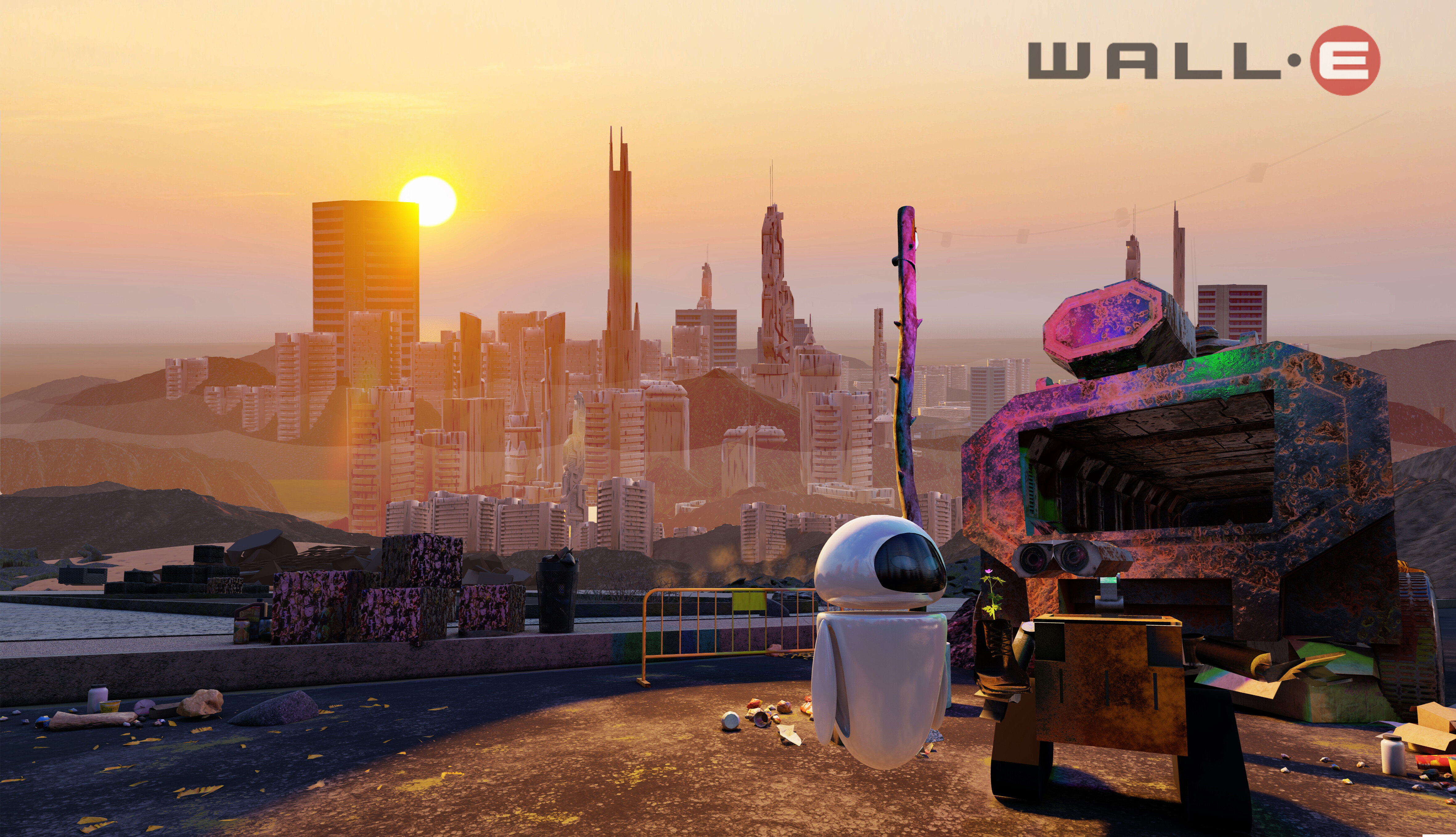 W tle mrocznych chmur śmieci unosi się para głównych bohaterów: sympatyczny robot Wall-E oraz elegancka i zaawansowana technologicznie robotka Eva. Wall-E, zbudowany do sprzątania, przemierza labirynt korytarzy zdeformowanych przez tony odpadów, zbierając i sortując śmieci, które kiedyś były częścią ludzkiego życia.
