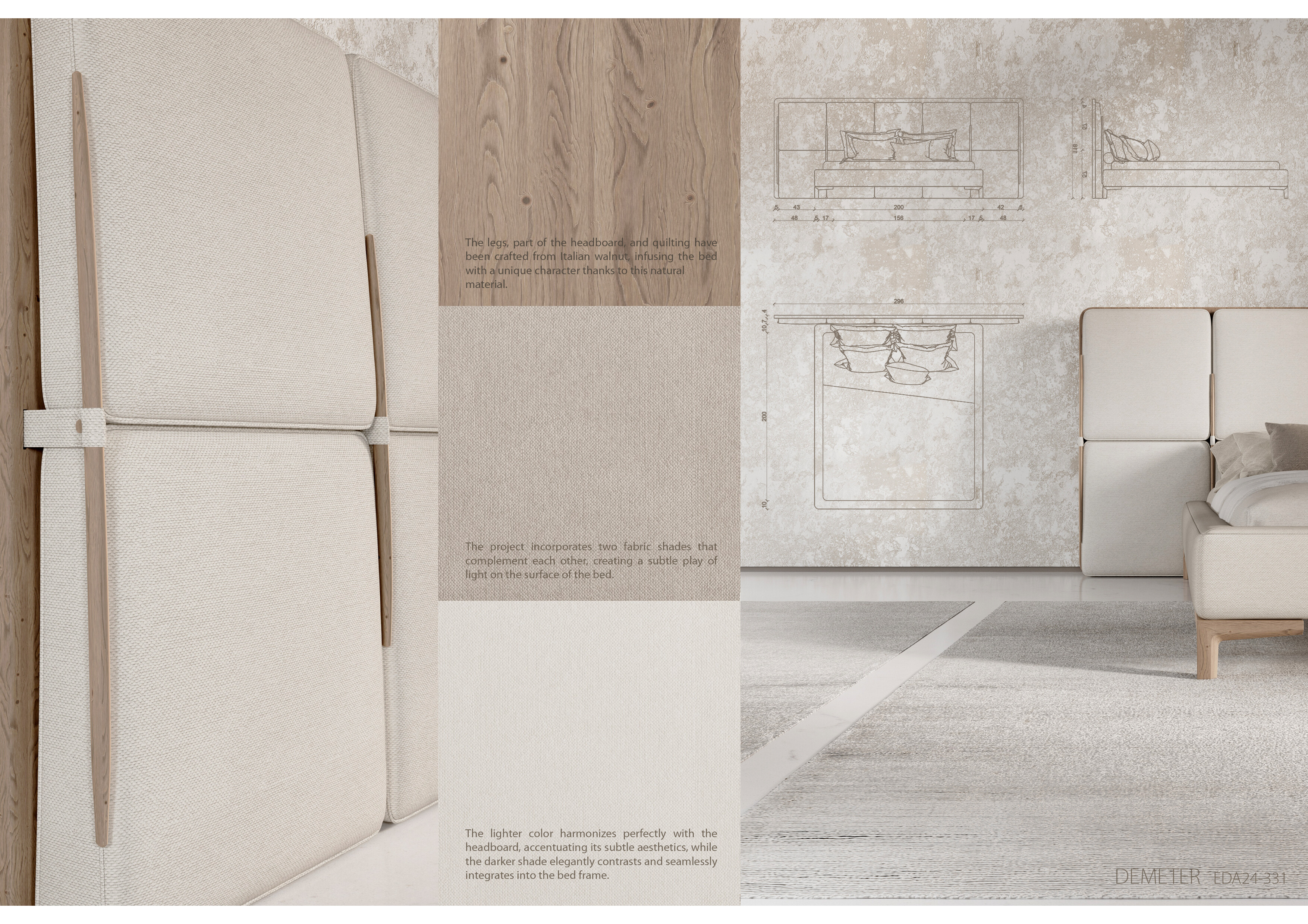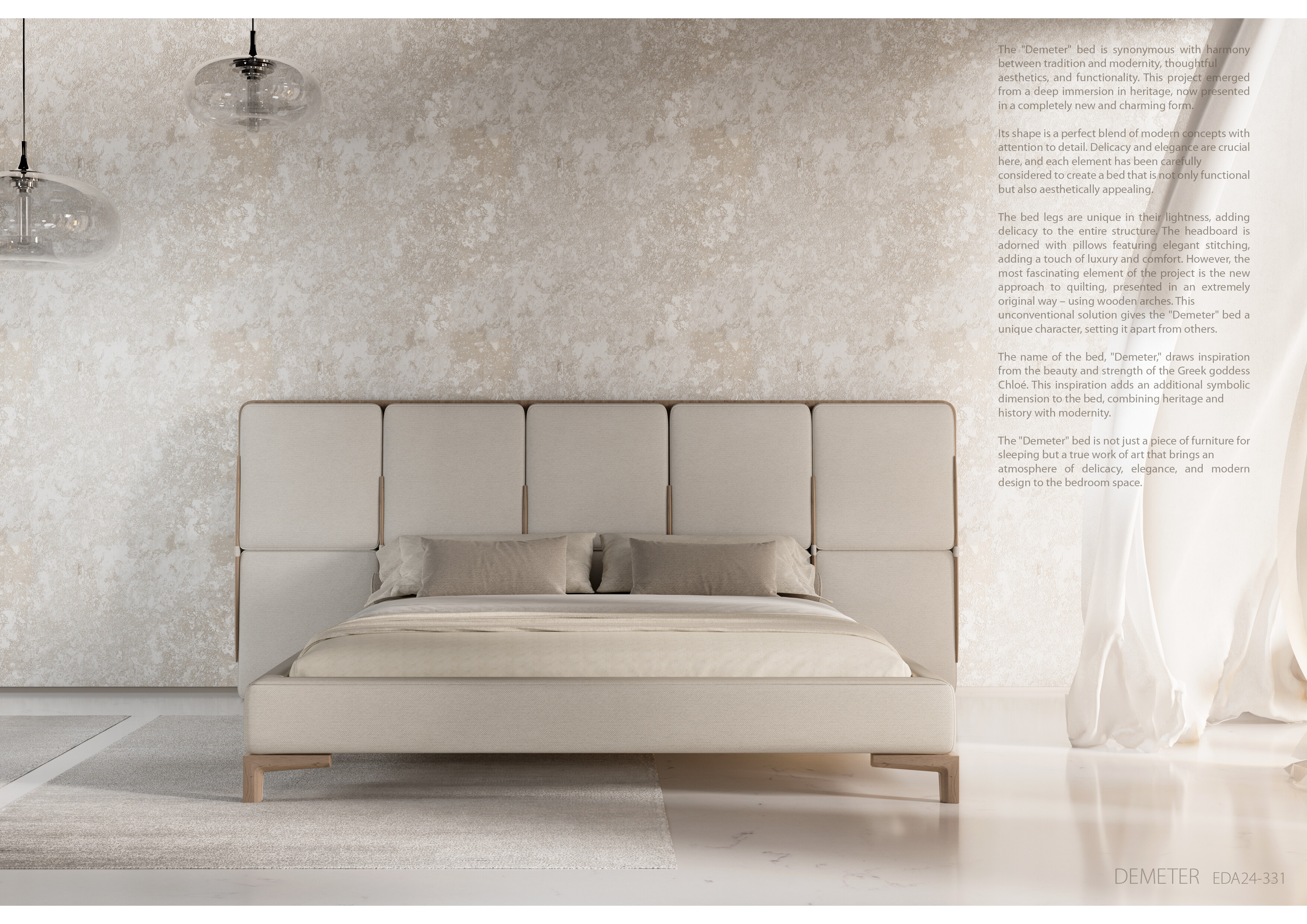 Łóżko "Demeter" jest synonimem harmonii między tradycją a nowoczesnością, przemyślaną estetyką oraz funkcjonalnością. Ten projekt powstał z głębokiego zanurzenia w dziedzictwo, teraz zaprezentowany w zupełnie nowej i uroczej formie.