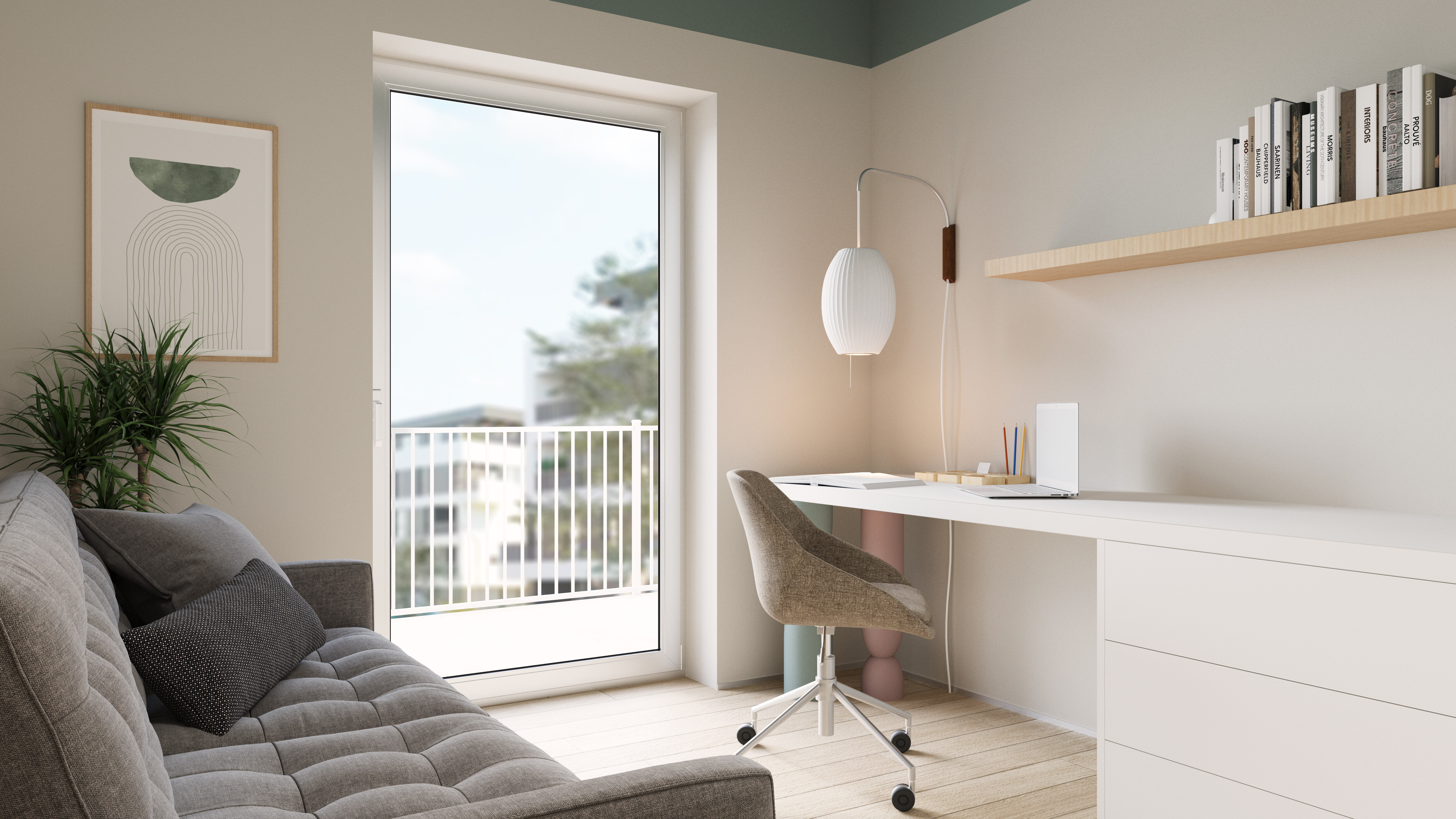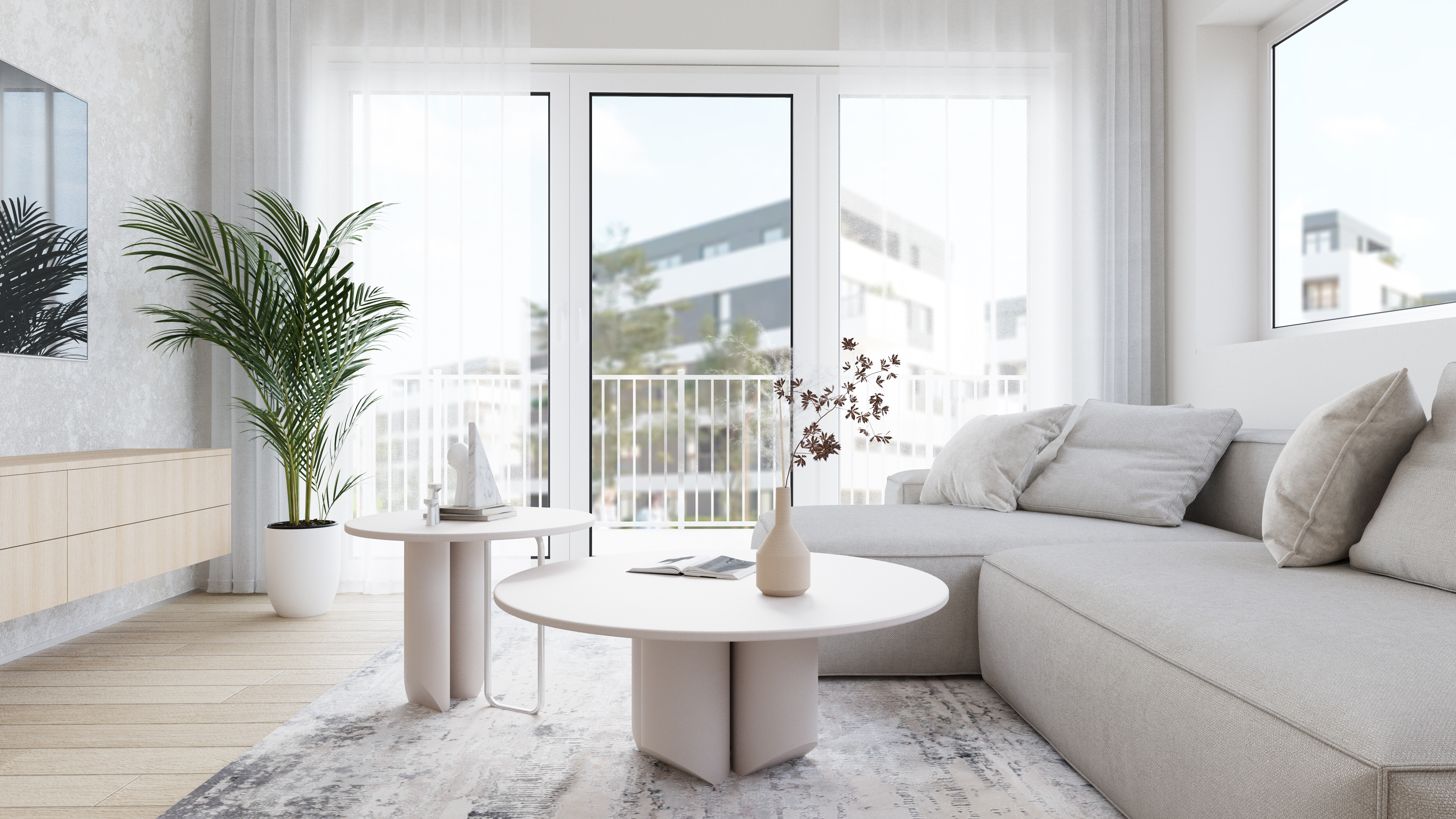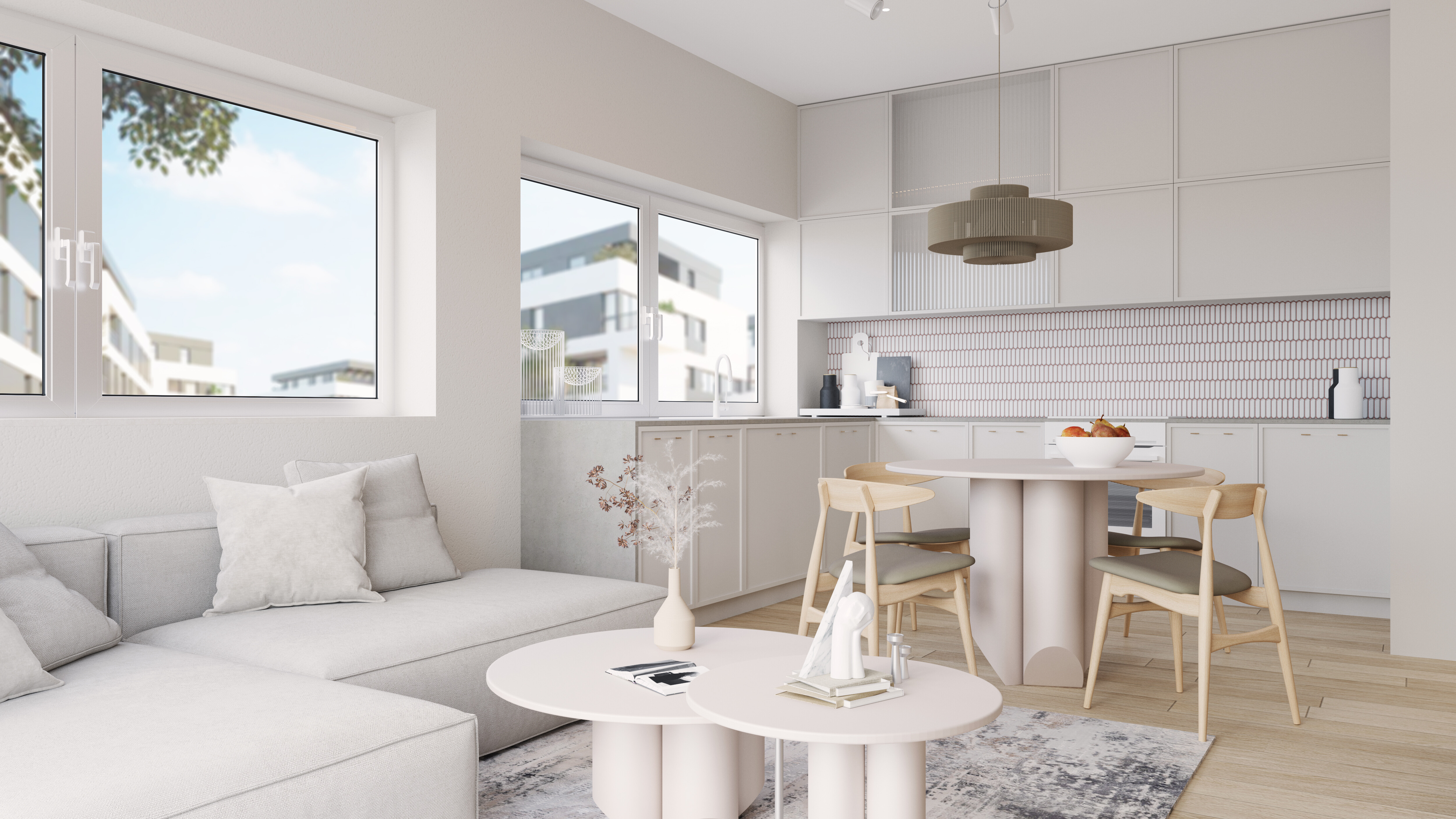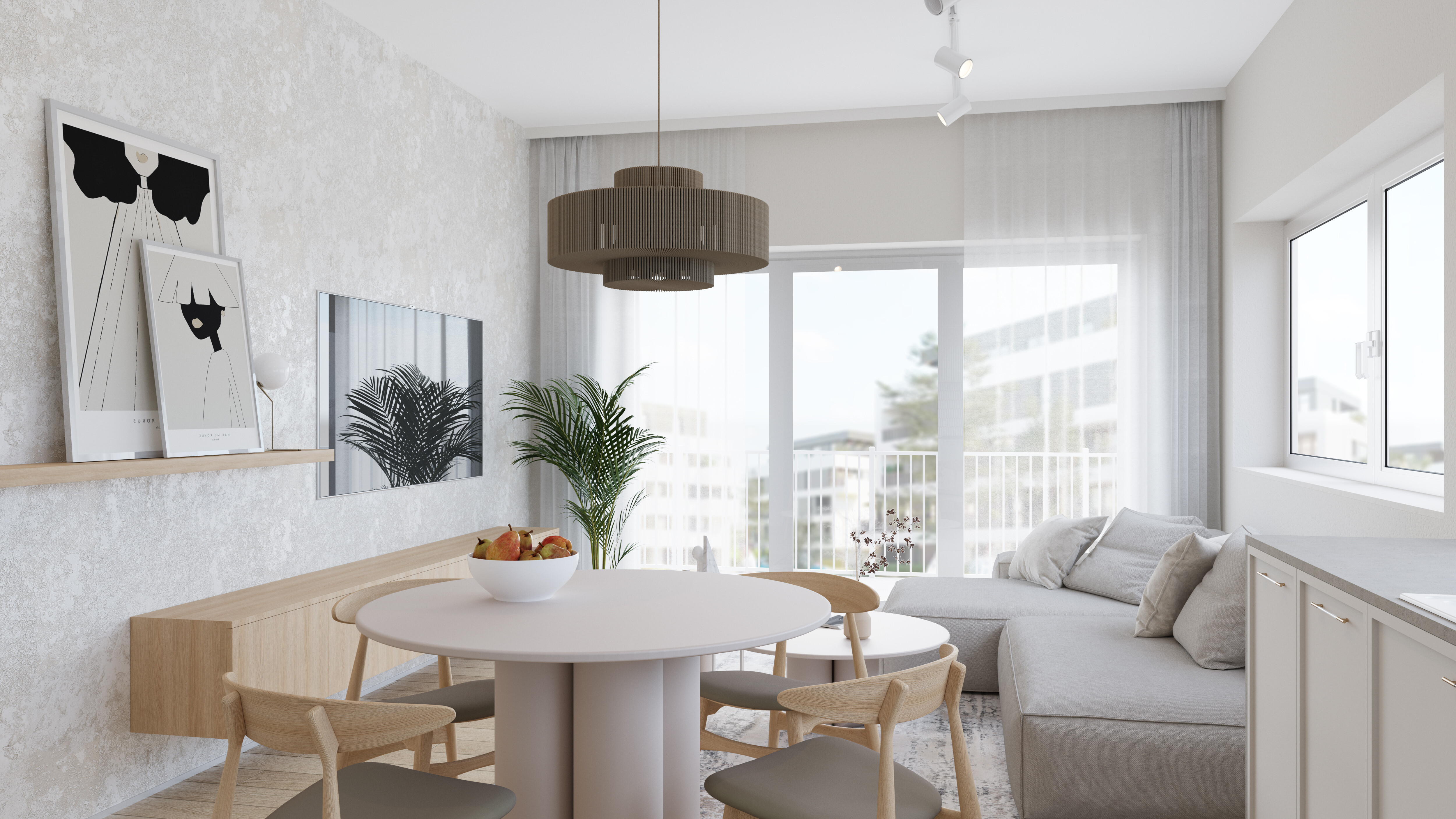 A major feature of this apartment is the large windows that let in natural light, making the space even more inviting and cozy. The walls painted in light shades of white further enhance the sense of spaciousness and airiness.