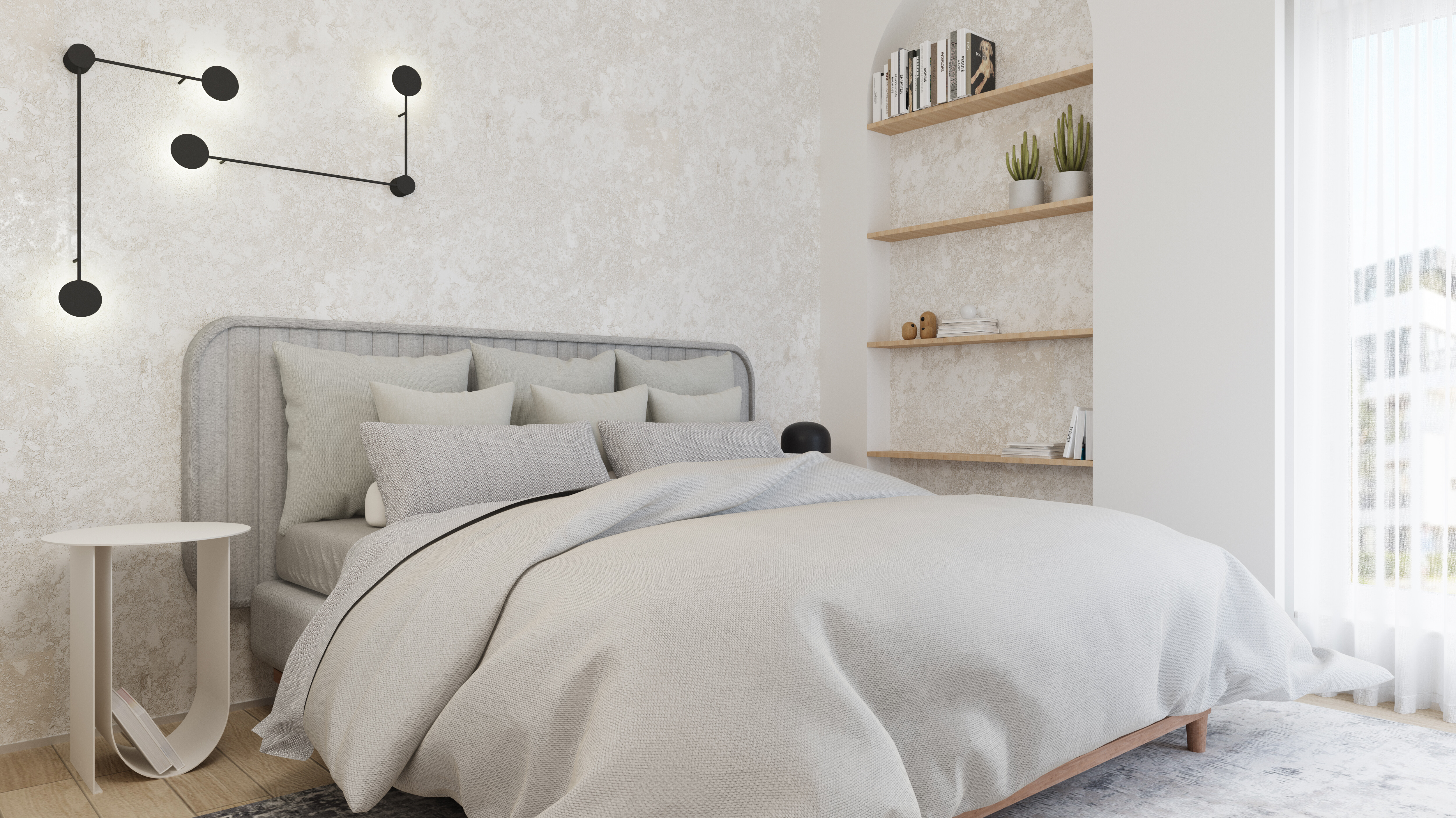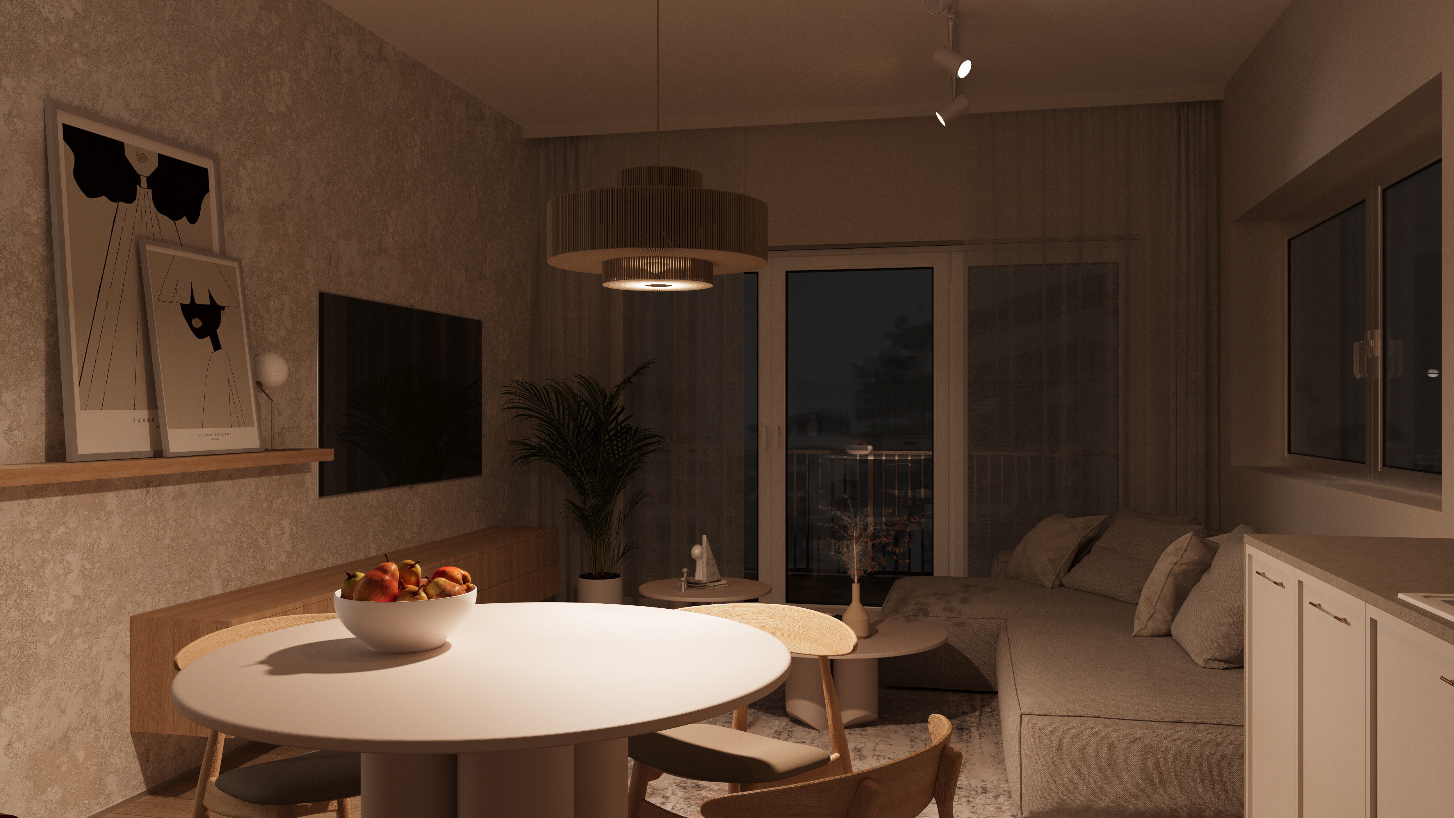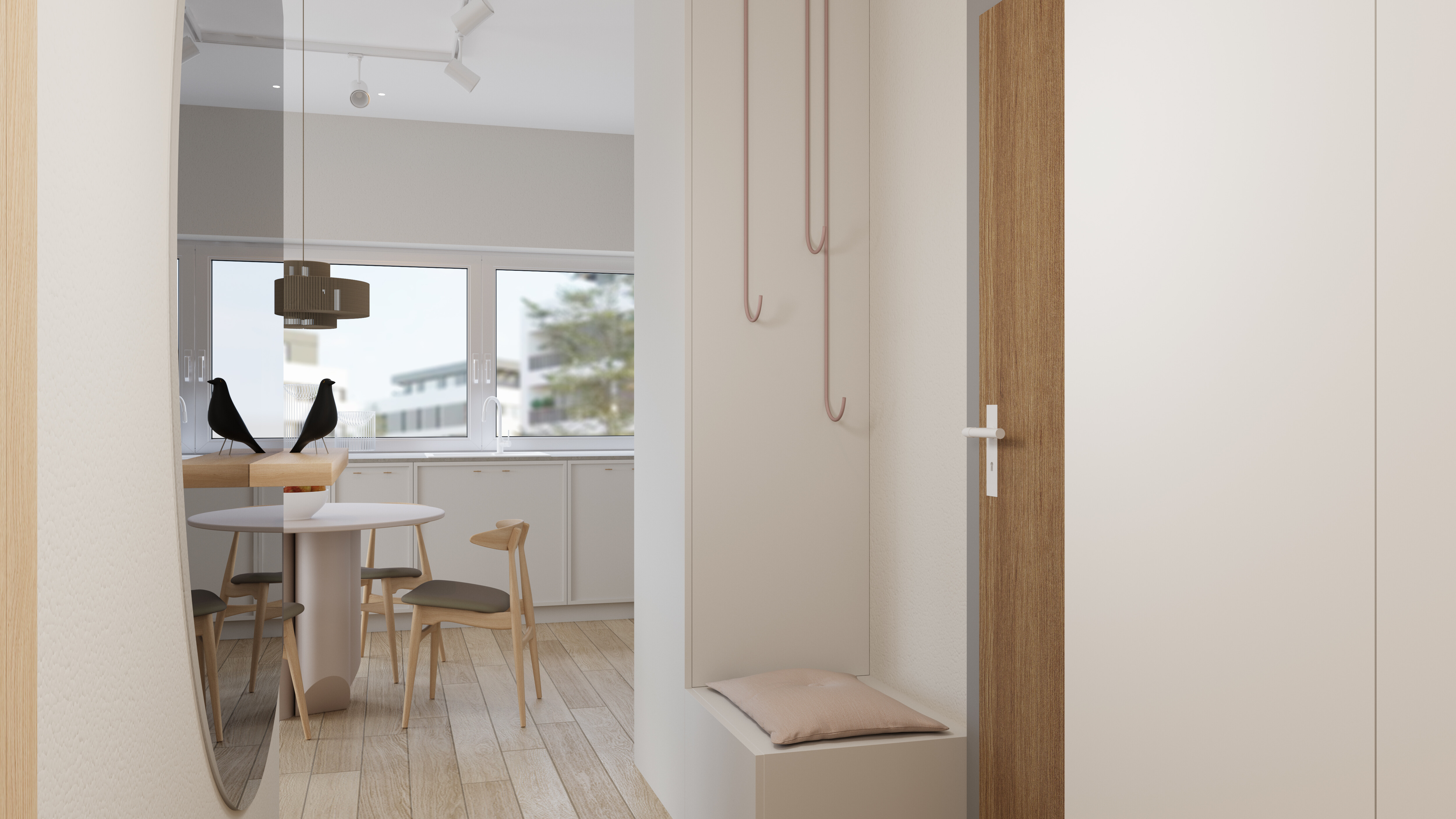 The overall arrangement is perfectly balanced, with each element carefully selected to create a harmonious and aesthetically pleasing space that is also functional and comfortable to live in. This apartment is an excellent example of how even a small space can be transformed into an elegant, modern, and spacious environment.