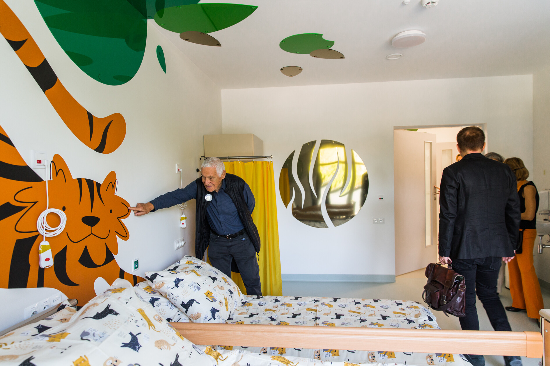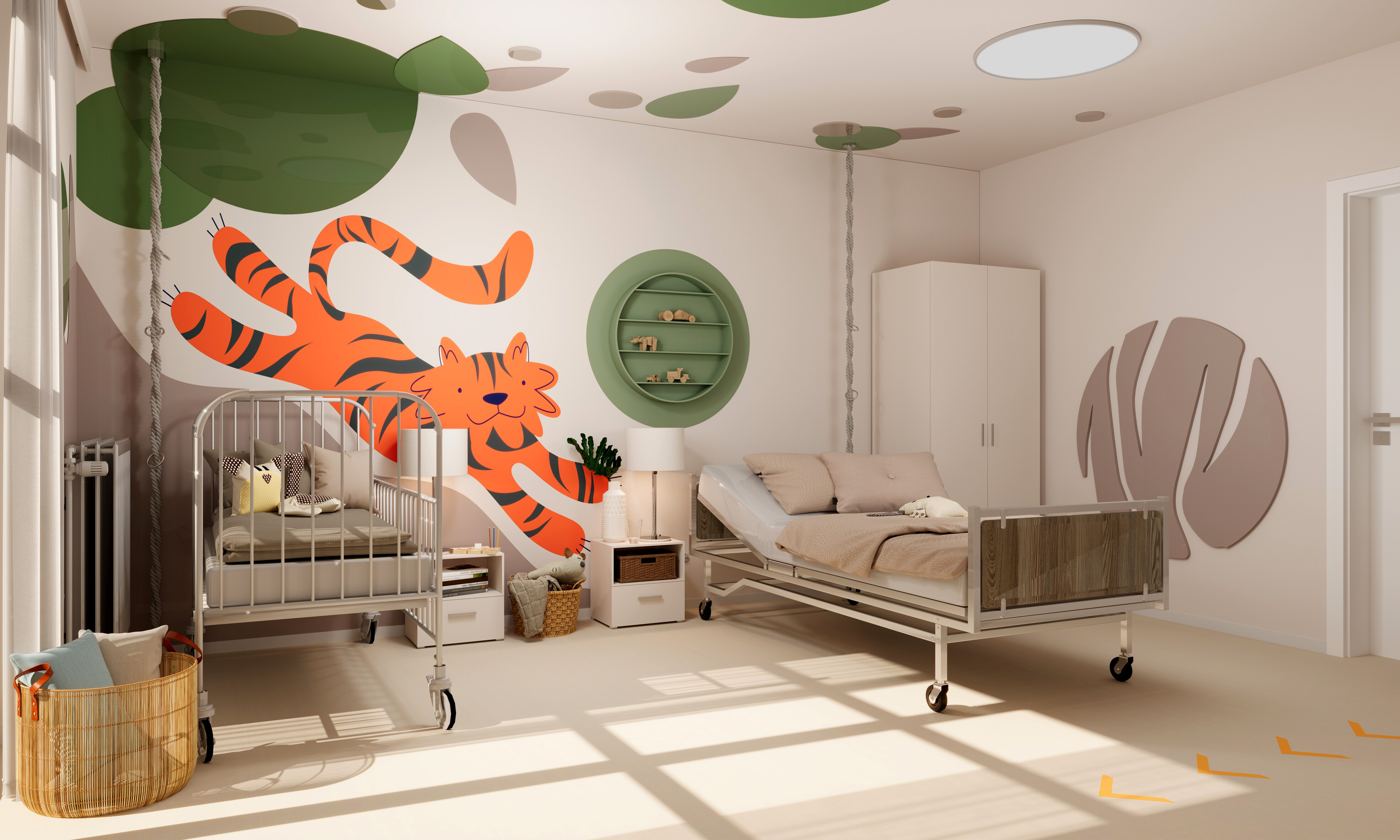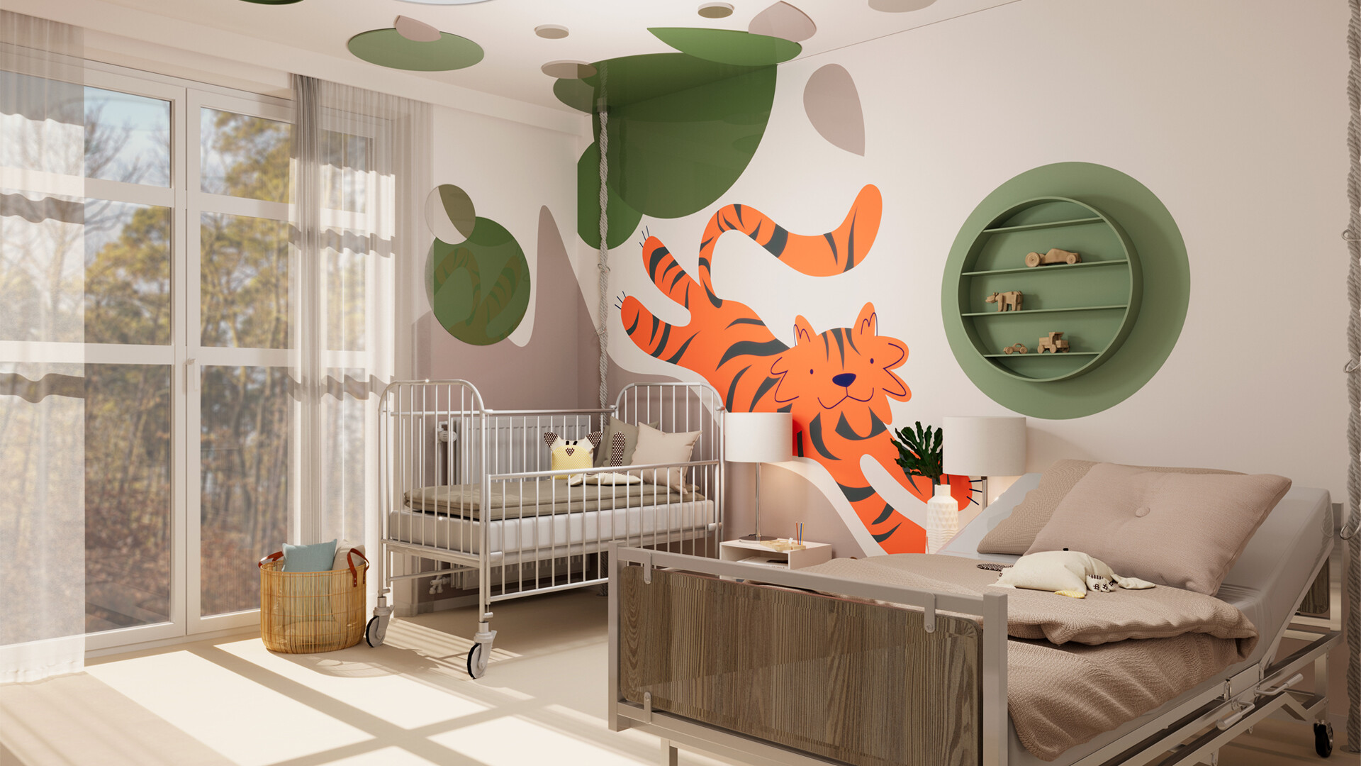 W pokoju "Tygrys" postawiłam na mocne i energetyzujące barwy, takie jak zieleń i pomarańcz, które doskonale współgrają z naturą otaczającą budynek – zielenią i drzewami widocznymi za oknem. Te intensywne barwy nie tylko dodają życia i energii pomieszczeniu, ale również mają pozytywny wpływ na samopoczucie i emocje pacjentów.