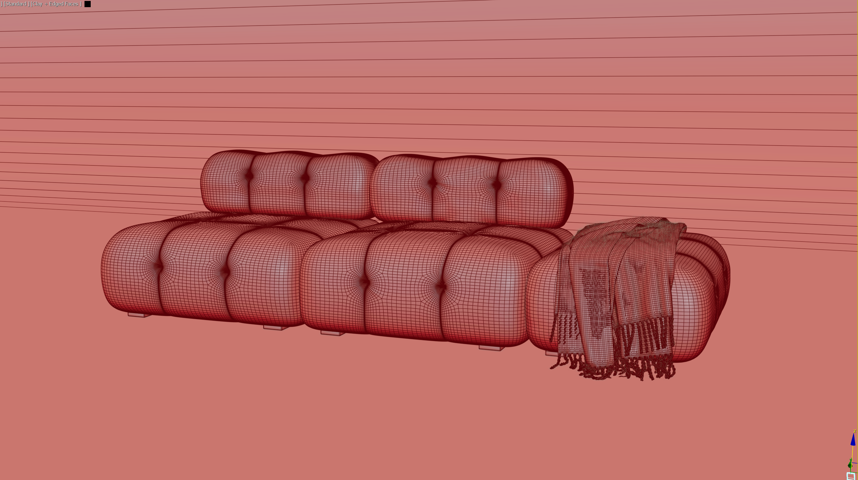 Kanapa została wymodelowana w ciągu 2 godzin. Teksturowanie zajęło około 30 minut, a oświetlenie – kolejne 30 minut. Wizualizacja została wykonana w programie 3ds Max Studio z wykorzystaniem silnika renderującego Corona. Render trwał 7 minut na procesorze Intel CPU.Koc jest gotowym assetem, dopasowanym do kanapy za pomocą modyfikatora Cloth.