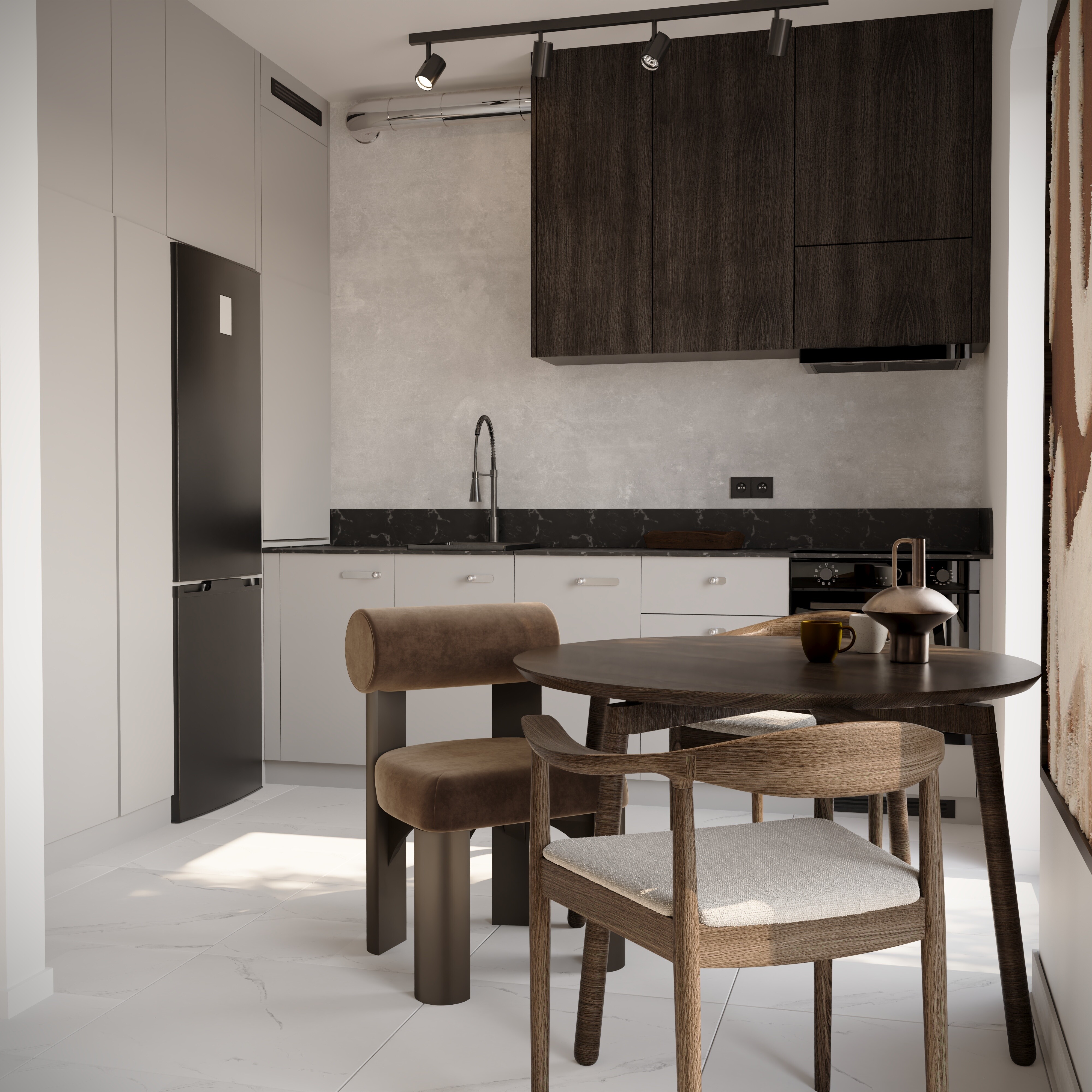 Wizualizacje przedstawiają kawalerkę o powierzchni 25 m², utrzymaną w jasnej, eleganckiej tonacji z wyraźnym kontrastem ciemnego drewna w kolorze czekolady. Minimalistyczna forma i stonowana paleta barw nadają wnętrzu spójność oraz poczucie harmonii.