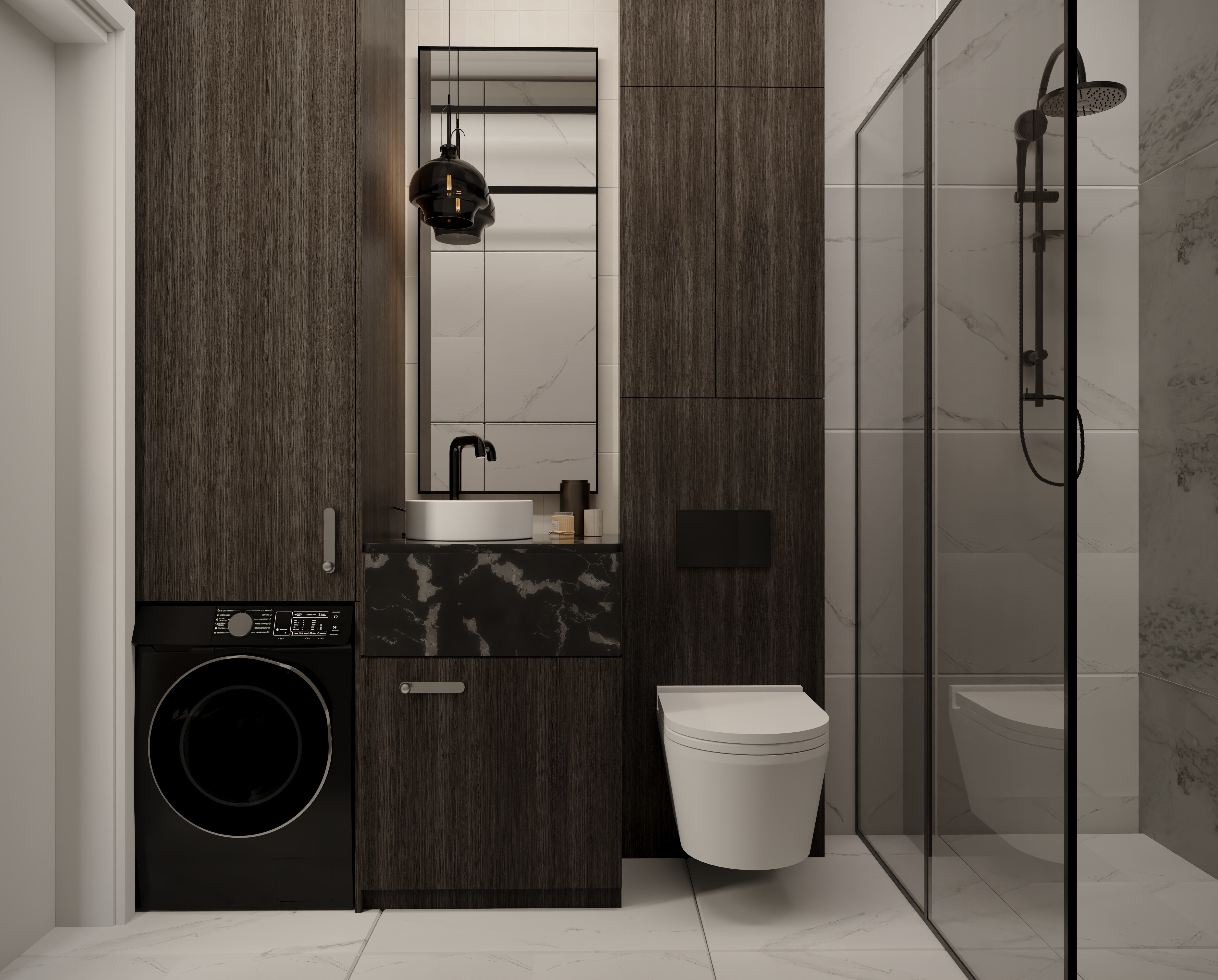 Łazienka została zaprojektowana w podobnym klimacie – z wykorzystaniem czekoladowego drewna i czarnej armatury w połysku, która dodaje wnętrzu elegancji i subtelnego luksusu.