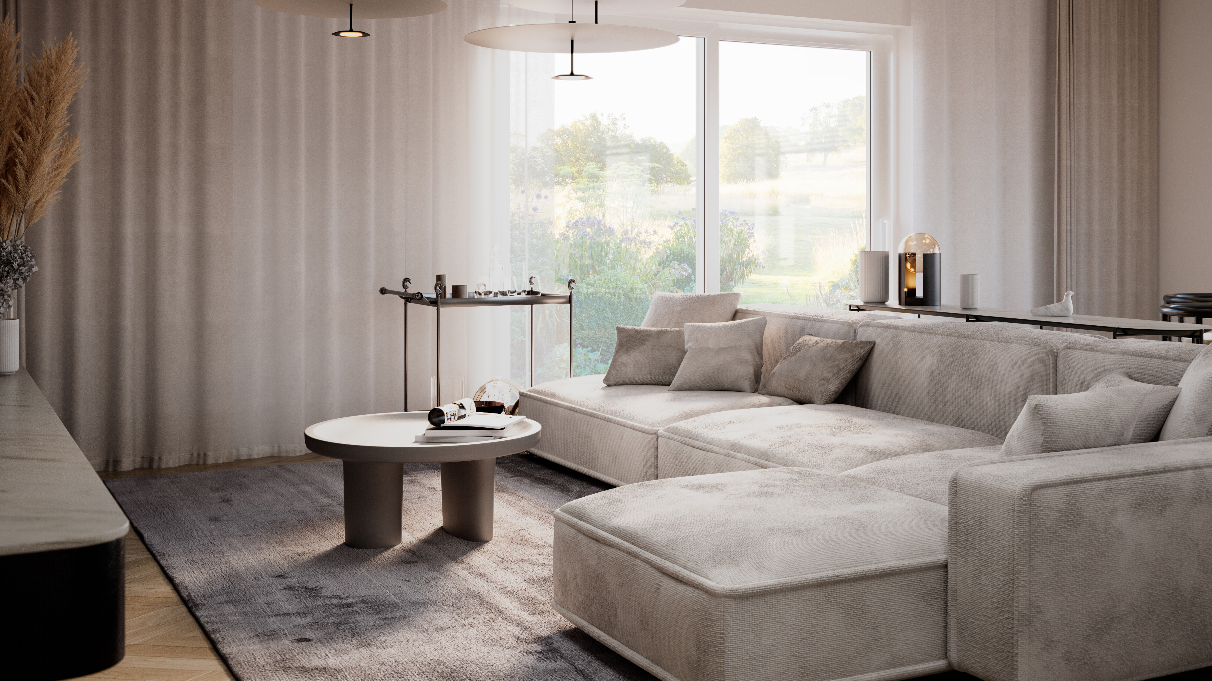 Całość aranżacji łączy elegancję z wygodą, tworząc spójną i nowoczesną przestrzeń do codziennego życia.