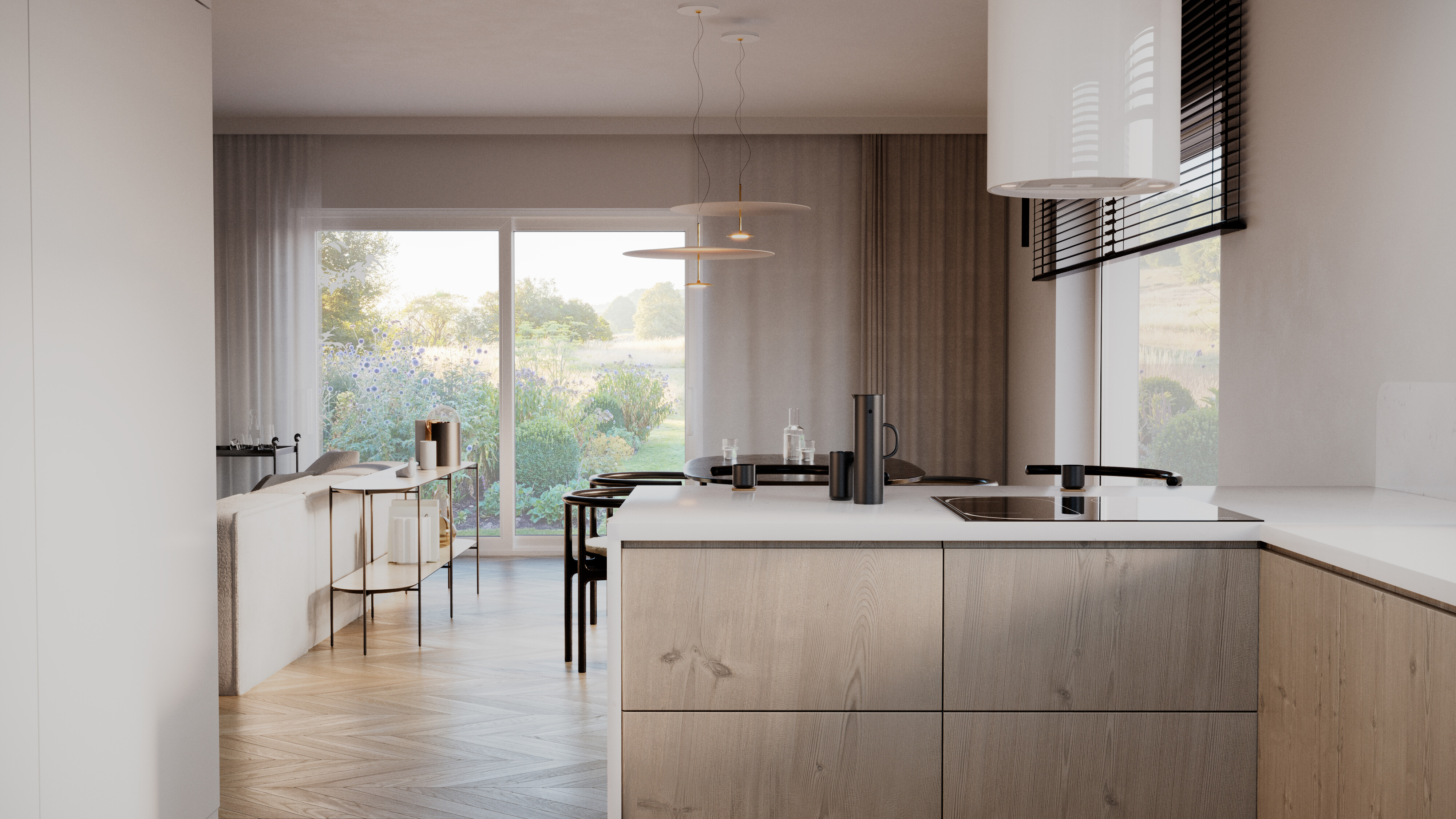 Kuchnia jest przestronna i jasna, a jej kamienny blat stanowi efektowny akcent. W zabudowie kuchennej dyskretnie ukryto drzwi prowadzące do pomieszczenia gospodarczego, co podkreśla funkcjonalność projektu.