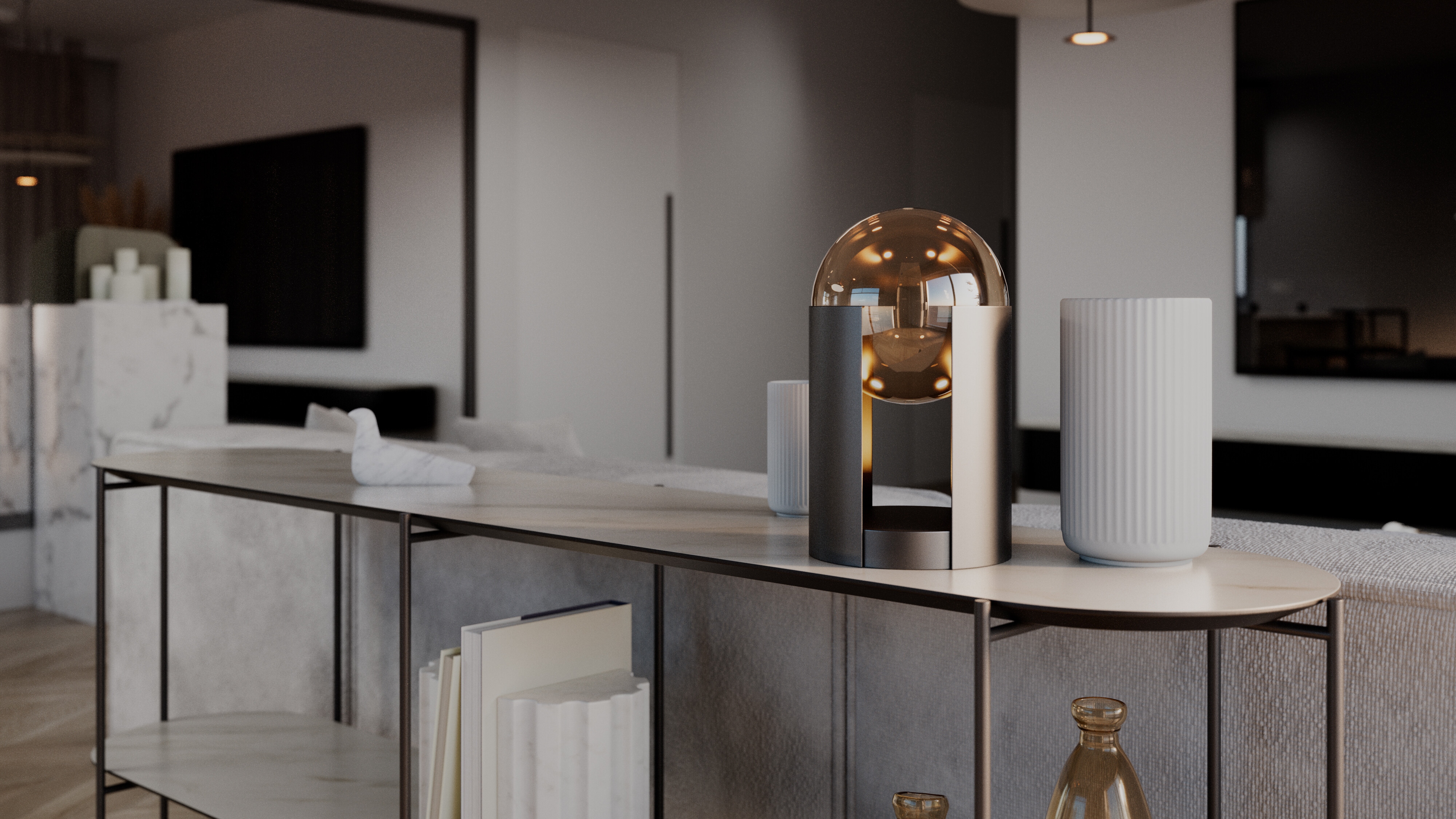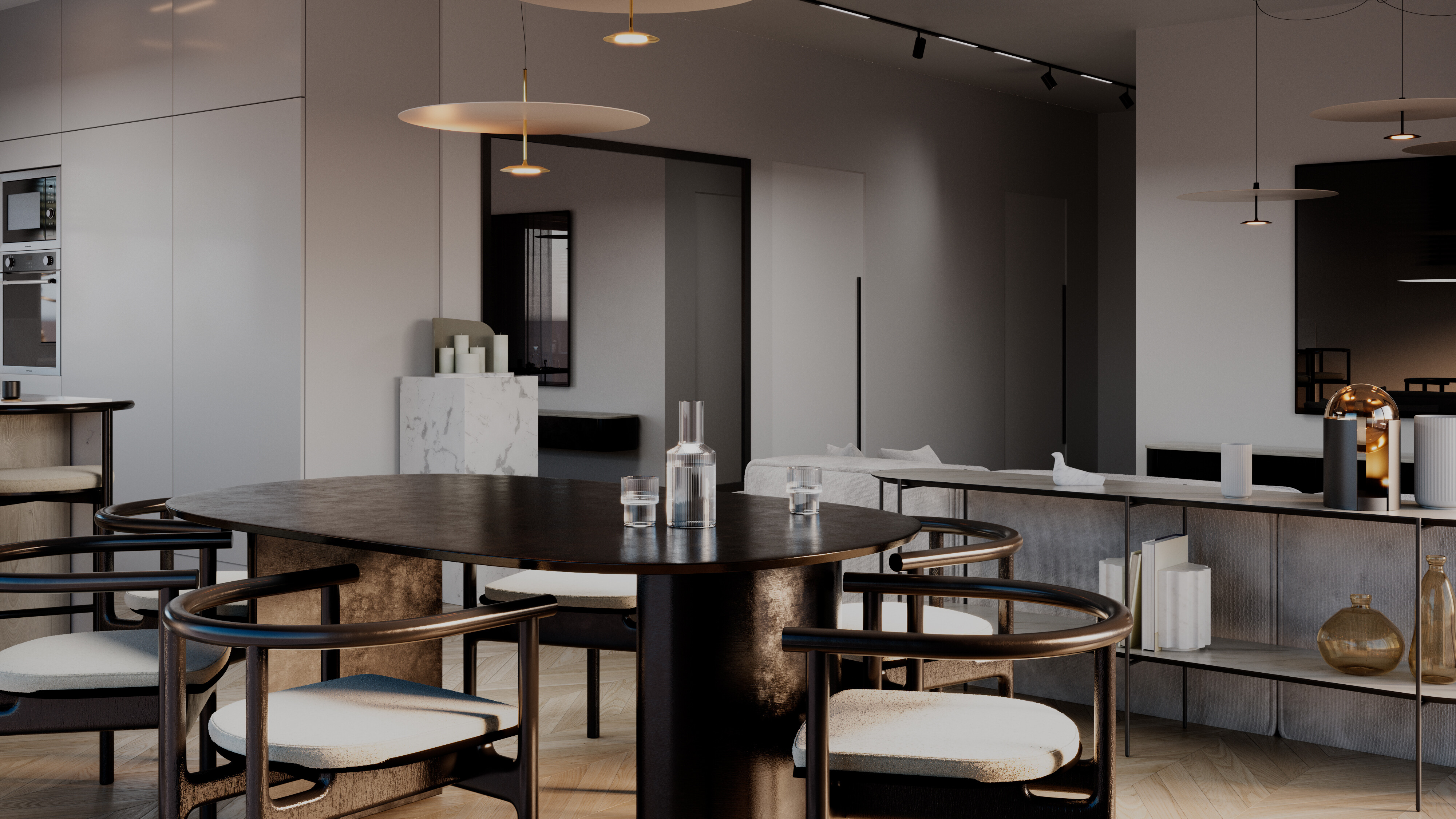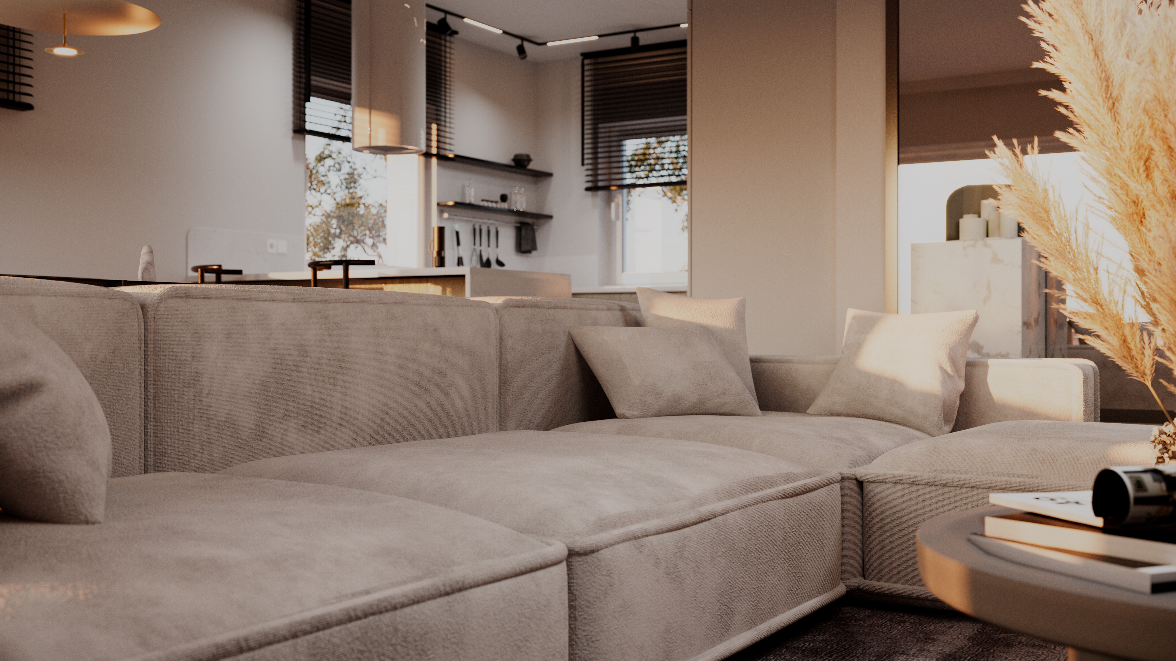 Projekt przedstawia nowoczesną aranżację przestrzeni dziennej, w której salon, jadalnia i kuchnia tworzą harmonijną całość. Dominująca kolorystyka to eleganckie połączenie beżu i czerni, nadające wnętrzu wyrafinowanego charakteru.