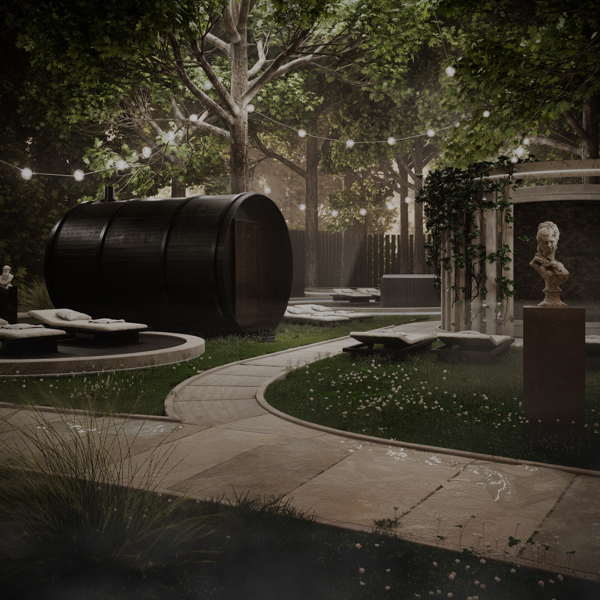 Projekt strefy SPA łączy harmonię z naturą i luksus, oferując przestrzeń do relaksu i regeneracji w otoczeniu zieleni. W centralnym punkcie znajduje się okrągła tężnia, która tworzy atmosferę mistycznej mgiełki, sprzyjającej głębokiemu odprężeniu.